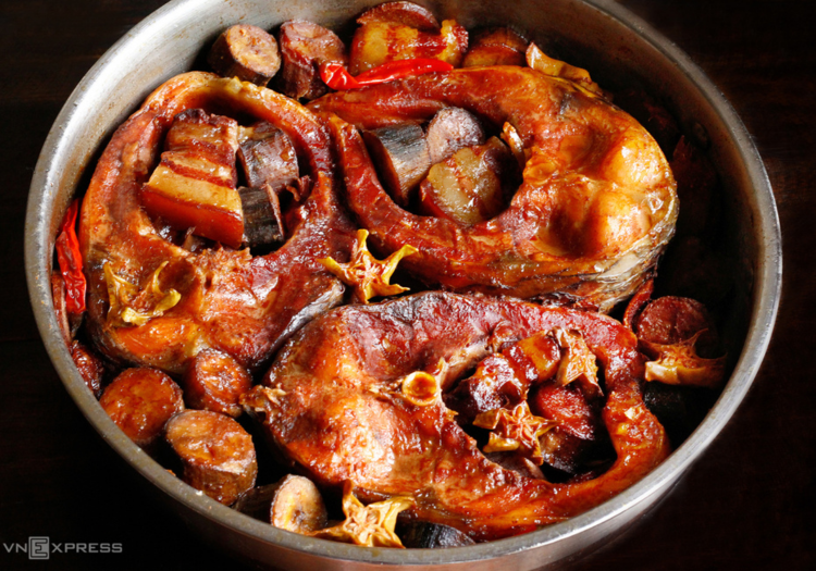Từng miếng cá kho săn chắc, đậm vị, nước kho sóng sánh, màu óng ả theo thớ thịt cá tựa vân gỗ cẩm lai, phần mỡ bụng cá trong, riềng bùi dẻo. Khi ăn cảm nhận rõ vị mềm béo, không bị khô, nếu kho lâu còn ăn được cả xương.