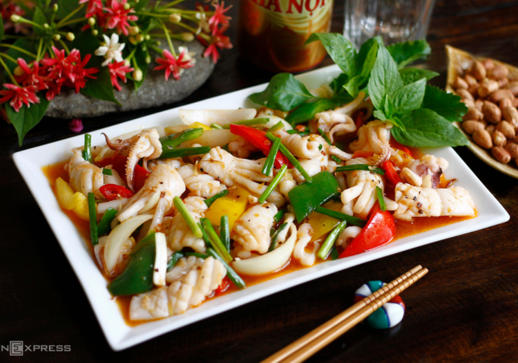 Mực giòn sần sật, vị cay nồng từ sa tế, rau của quả chín tới giòn ngọt kích thích vị giác.