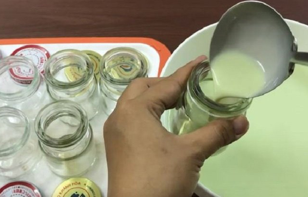 Chia đều hỗn hợp sữa đã trộn ở bước 2 vào các hũ đựng đã chuẩn bị sẵn, đậy nắp kín.