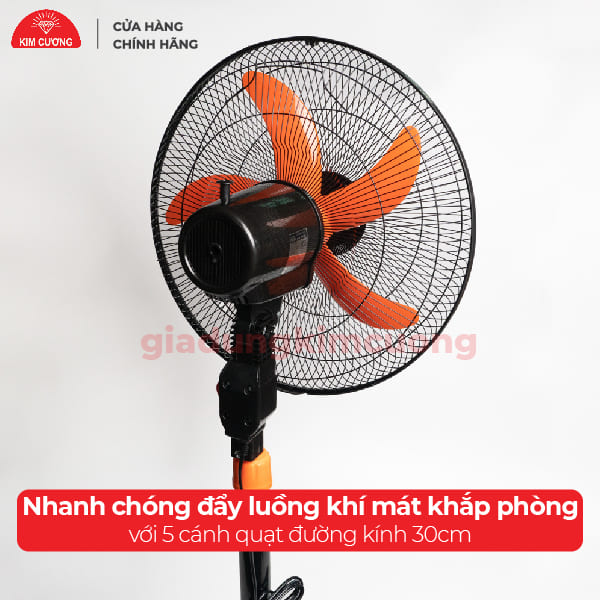 Quạt đứng Kim Cương với chiều cao tổng thể là 130cm và nặng 6kg giúp việc di chuyển quạt không quá khó khăn. Trong đó, quạt có cấu tạo cơ bản gồm: